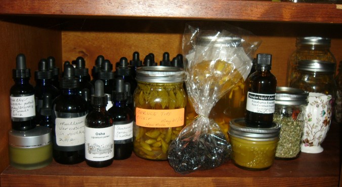 My feeling is, this aspect of herbal cold care is very personal. Astragalus, reishi (and other) mushrooms and elderberry are better choices for many individuals,and one should exercise caution even with these, if the patient has an Auto-immune condition (diabetes, multiple sclerosis, Grave’s , lupus). I tend to fall back on Elder – but this time emphasize the berry, in tincture or elixir, taken in fairly high dose but at intervals throughout the day. While the flower helps move fluid with it’s diaphoretic action, the berry goes to work strengthening – balancing, really – the immune system, so my standard approach is to add a teaspoon of elixir or dropperful of tincture 3 – 5 times daily as needed. Elderberry tincture is a must-have for any herbalist and readily available, but elixir is something we make ourselves, and so I include the recipe here. I first learned how to make it from Kiva Rose, so I reference her recipe here: