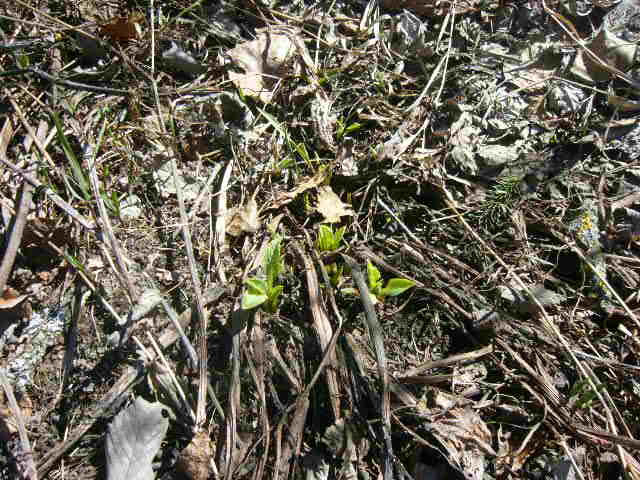 Clockwise from the left/top: ramps, trillium, a straggly but determined little mullein,and trout lily.Give these guys two weeks and they’ll be glorious!